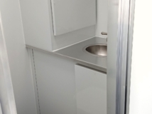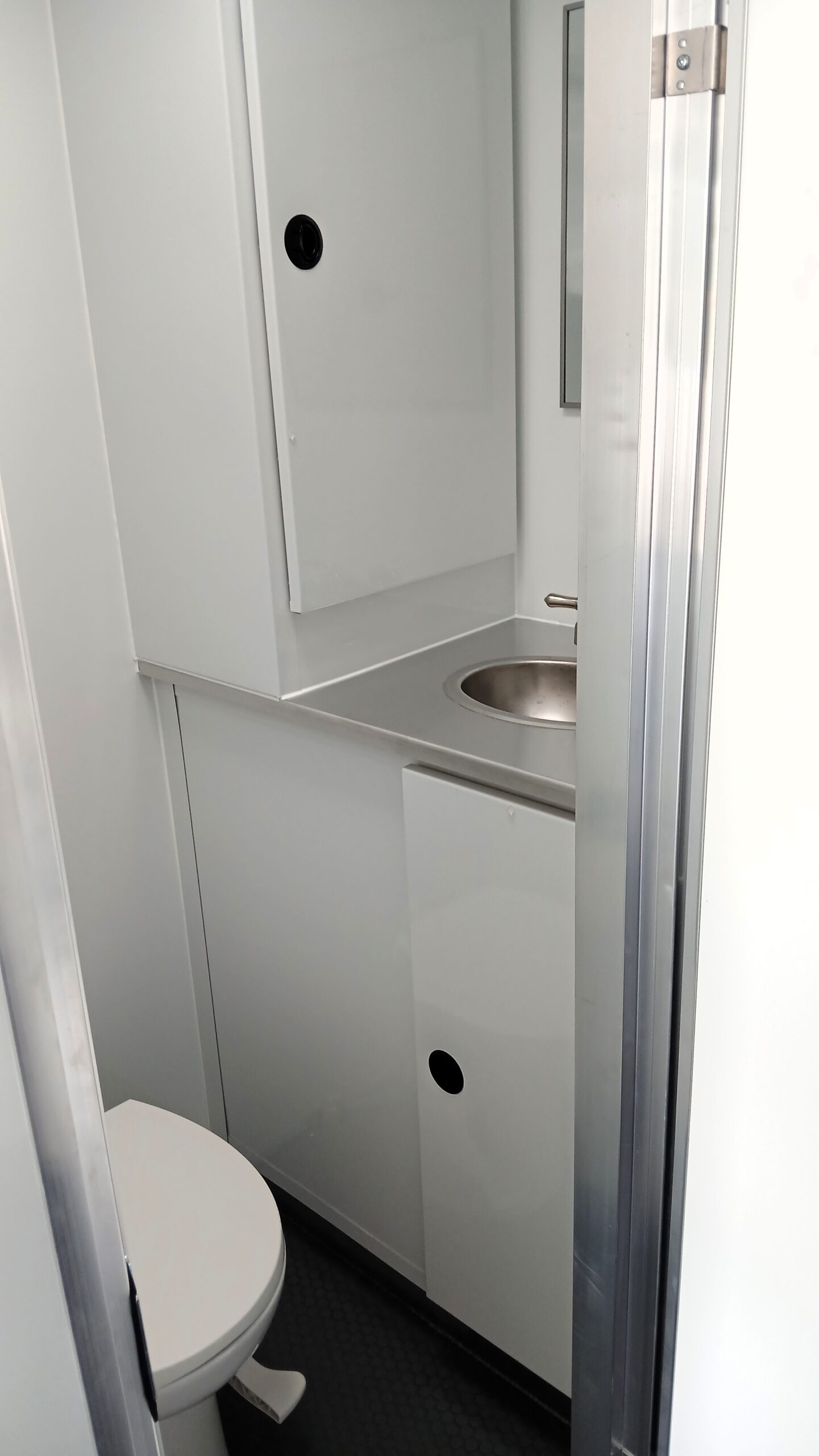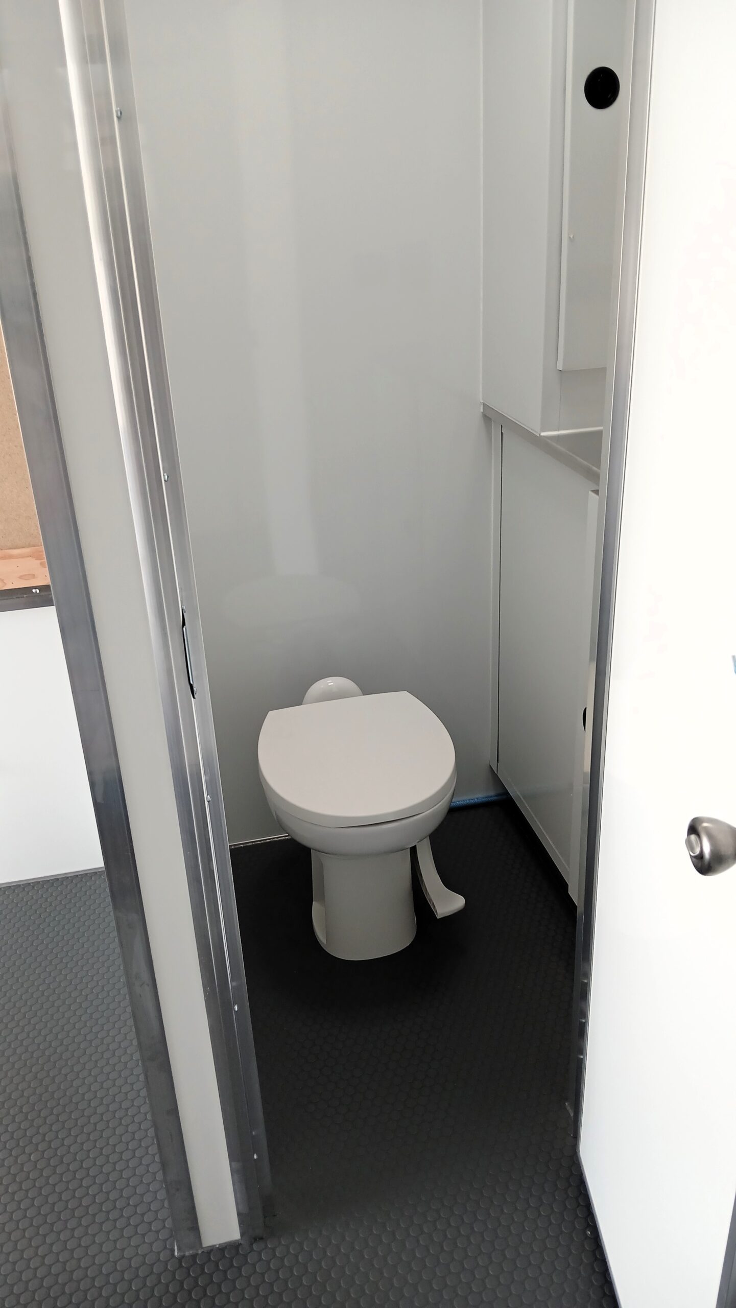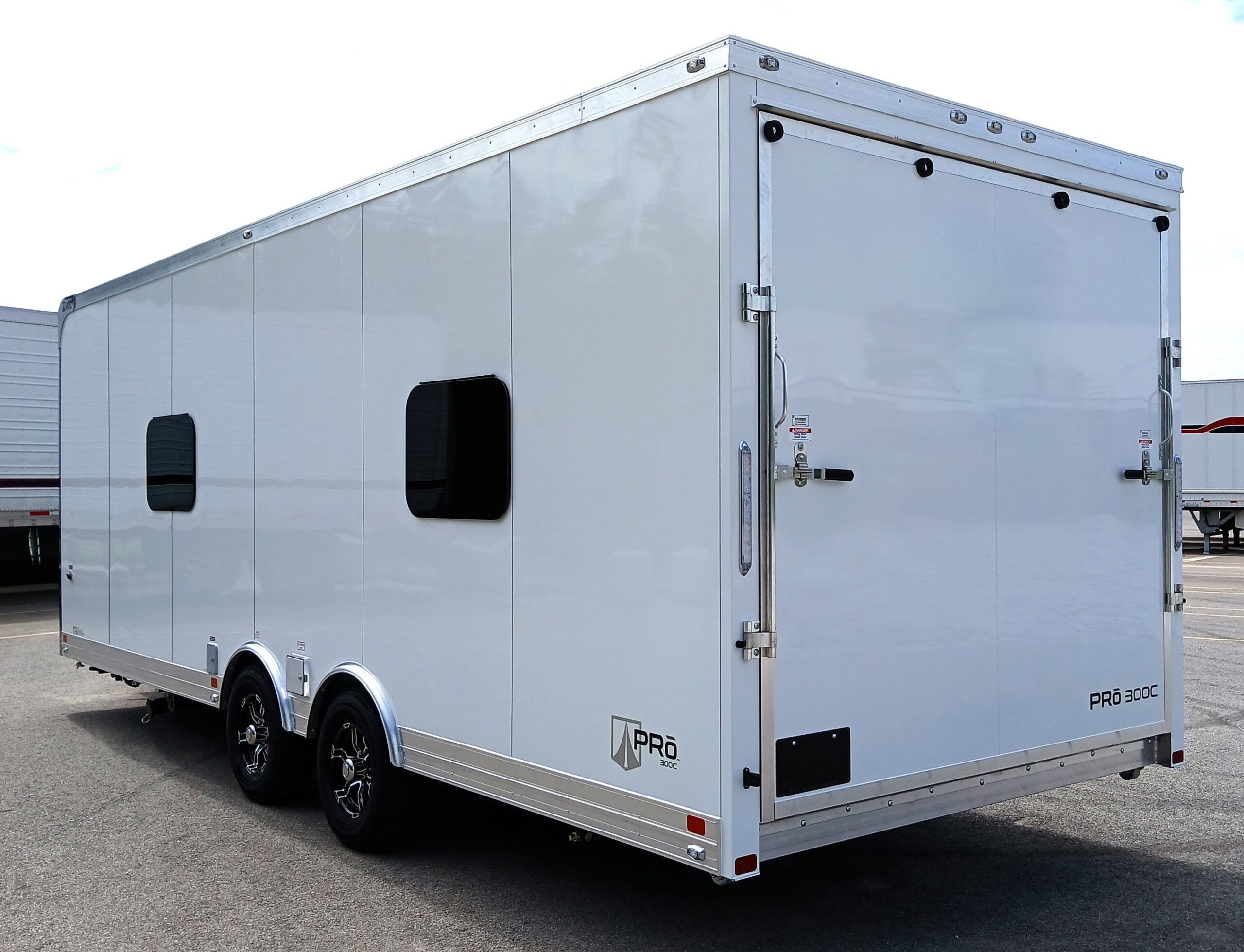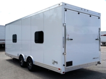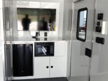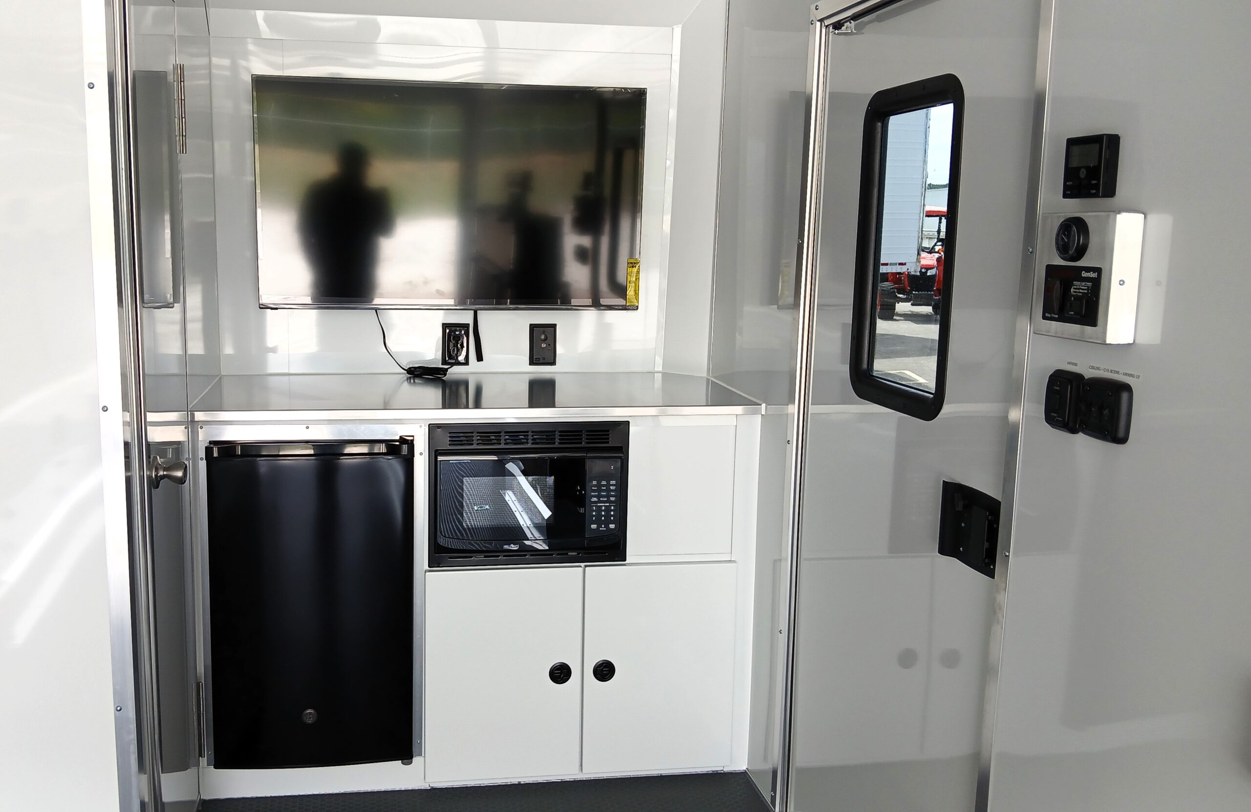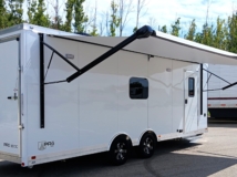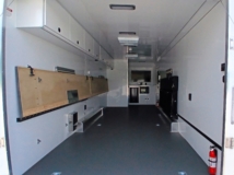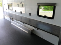 This is a 24 ft command response trailer with a total weight under 6,000 pounds. To target rust prevention, it has an all aluminum frame (no wood or steel in the construction); which creates a longer lasting trailer, with no rotting wood or rusting steel. This model includes the built-in Onan generator, kitchenette, bathroom, fold up desk, fold up bench seating, LED lighting, electric roll out awning, and much more. This model can be used to haul large items in the center with all the fixtures folded up. The desk/bench can then be folded down when ready to use.